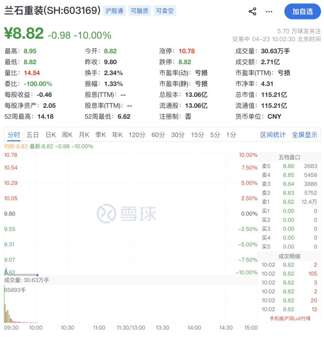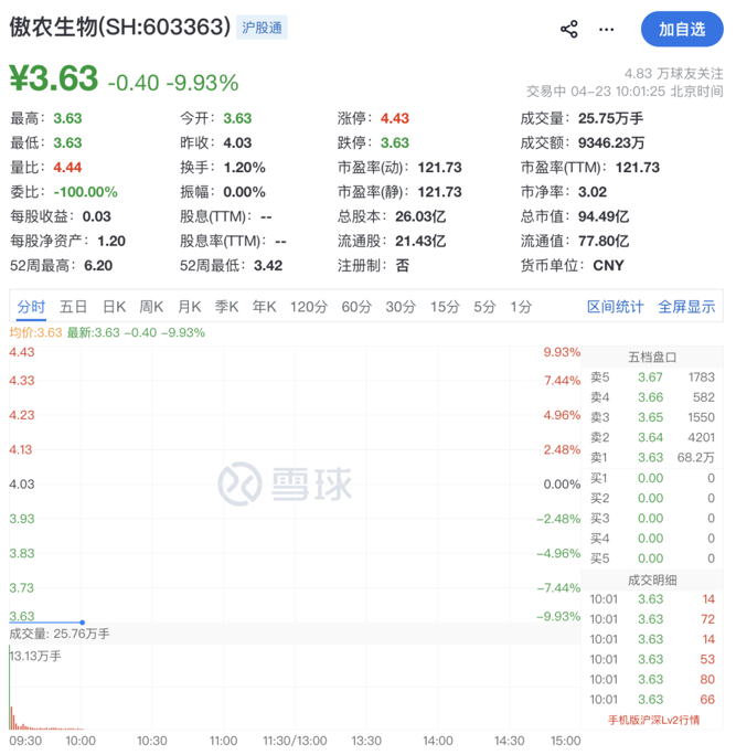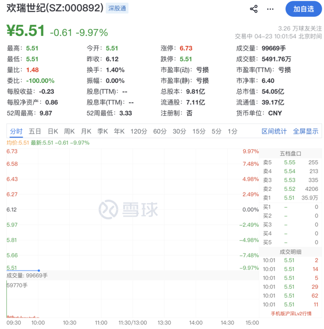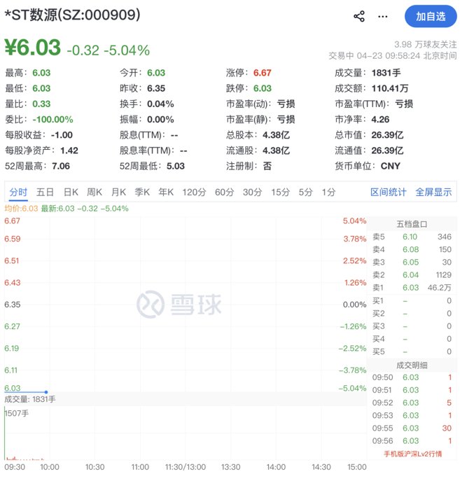 4月23日,*ST数源、傲农生物、欢瑞世纪、兰石重装股价纷纷跌停。