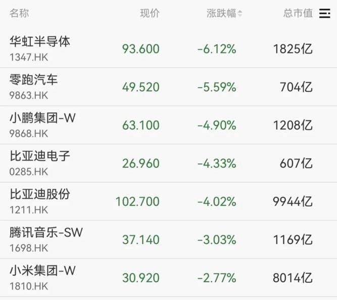 港股方面,恒生科技指数跌幅扩大至2%,华虹半导体、零跑汽车、小鹏集团等跌幅居前。
