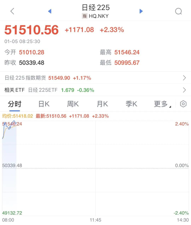 2026年1月5日,日韩股市开盘大涨,受芯片和重工业股带动,日经225指数涨超2%,突破51000点,创下自2025年12月12日以来的阶段新高。