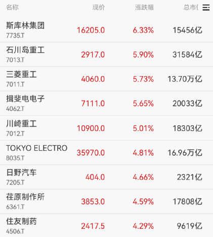 日本AI概念股走高,软银集团、东京电子、爱德万测试均涨超4%。此外,日本三菱重工业公司股价上涨5.7%,川崎重工业公司股价上涨5.01%。