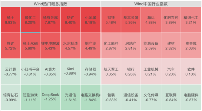【导读】有色金属板块节后延续强势,稀土爆发,磷化工走强,航运、商业航天概念股纷纷上涨;影视院线概念股再度下挫