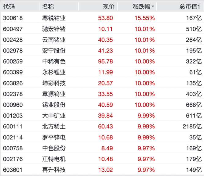 20余只相关个股涨停。北方稀土、华锡有色、锡业股份、驰宏锌锗、云南锗业、中稀有色、章源钨业、永杉锂业、坤彩科技、中色股份、罗平锌电、再升科技、大中矿业均录得涨停。
