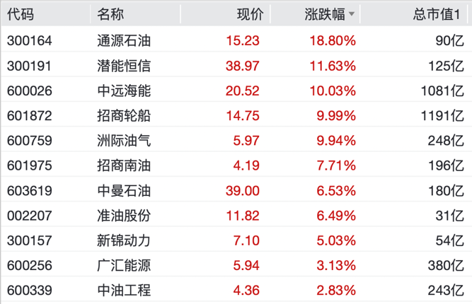 通源石油涨超18%,潜能恒信涨超11%,中远海能、招商轮船、洲际油气均再次涨停。