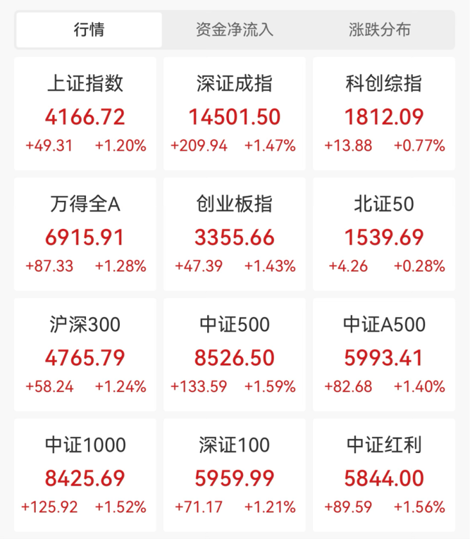 截至午间收盘,沪指报4166.72点,涨1.2%;深证成指涨1.47%,创业板指涨1.43%,科创综指涨0.77%,北证50指数涨0.28%。