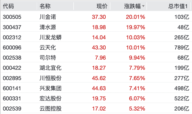 川金诺、清水源录得20cm涨停,川发龙蟒、云天化、司尔特录得10%涨停。湖北宜化、兴发集团、川恒股份、宏达股份等涨超6%。