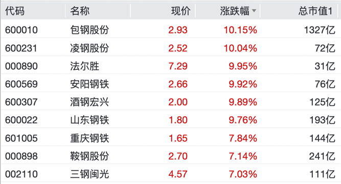 今日上午,钢铁板块集体走强。包钢股份、凌钢股份、安阳钢铁、法尔胜、酒钢宏兴纷纷涨停。