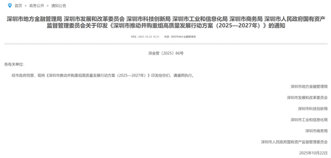 【导读】深圳市推动并购重组高质量发展行动方案(2025-2027年)发布10月22日,深圳市地方金融管理局等印发《深圳市推动并购重组高质量发展行动方案(2025—2027年)》。
