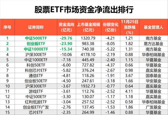 另外,创业板ETF、中证1000ETF等宽基ETF昨日分别净流出23.9亿元、15.34亿元,也居于市场靠前位置。