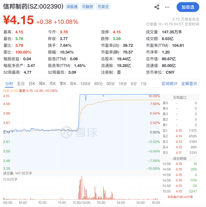 12月10日,信邦制药股价午盘异动,股价直线拉升涨停。截至收盘,该股报4.15元/股,总市值为80.67亿元。
