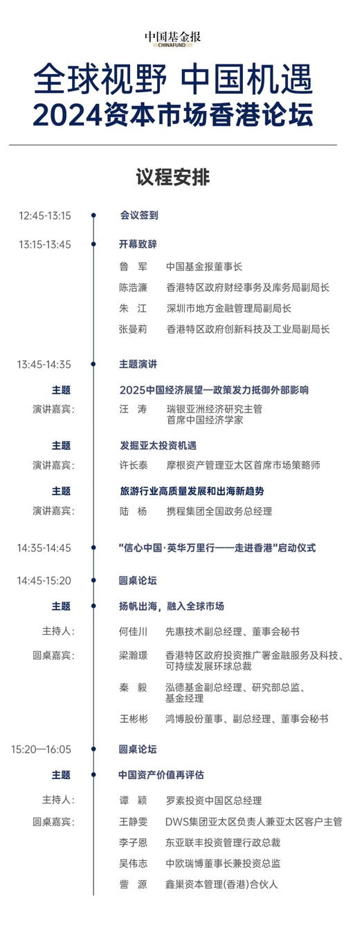 11月21日,中国基金报将以“全球视野 中国机遇”为主题,召开2024资本市场香港论坛。本次论坛将汇集深港两地监管机构、顶尖全球金融机构经济学家、策略师、相关业务负责人和中国企业出海代表,一起探讨新的环境下,中国企业扬帆出海捕捉全球机遇的新进展,畅议变革时代中国资产价值重估的方法和机遇。