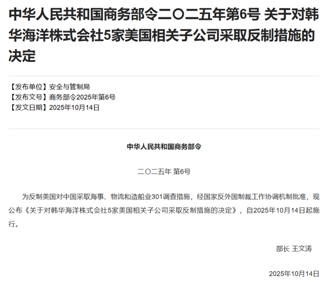 10月14日,商务部发布公告称,为反制美国对中国采取海事、物流和造船业301调查措施,经国家反外国制裁工作协调机制批准,公布《关于对韩华海洋株式会社5家美国相关子公司采取反制措施的决定》,自2025年10月14日起施行。