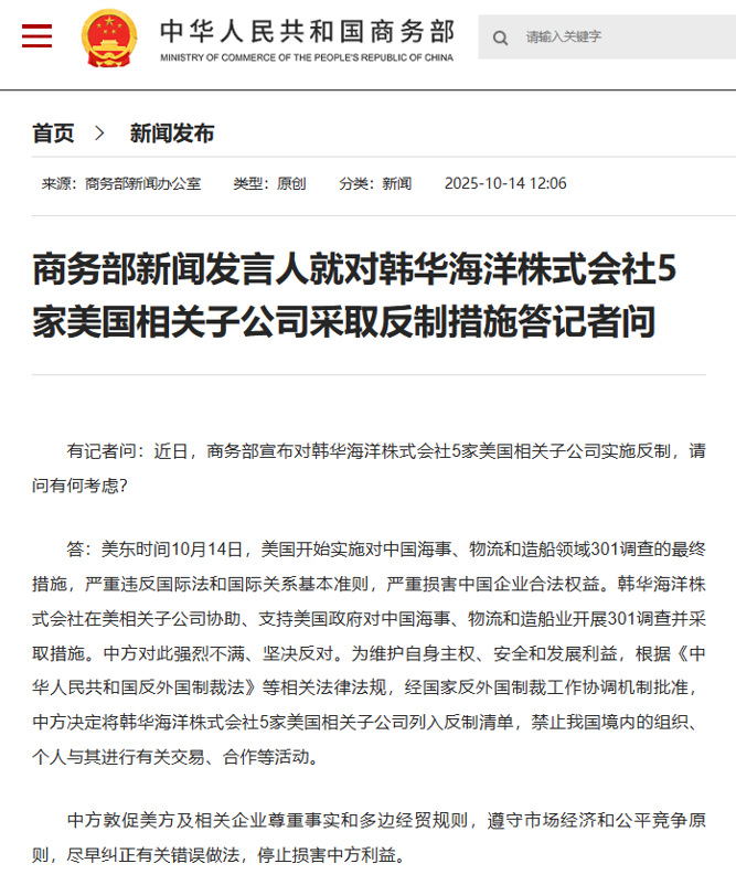 针对上述问题,商务部新闻发言人表示,美东时间10月14日,美国开始实施对中国海事、物流和造船领域301调查的最终措施,严重违反国际法和国际关系基本准则,严重损害中国企业合法权益。韩华海洋株式会社在美相关子公司协助、支持美国政府对中国海事、物流和造船业开展301调查并采取措施。中方对此强烈不满、坚决反对。为维护自身主权、安全和发展利益,根据《中华人民共和国反外国制裁法》等相关法律法规,经国家反外国制裁工作协调机制批准,中方决定将韩华海洋株式会社5家美国相关子公司列入反制清单,禁止我国境内的组织、个人与其进行有关交易、合作等活动。
