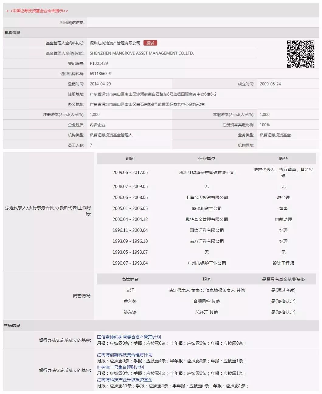 基金业协会官网的私募基金备案登记信息显示,深圳红树湾资产成立于2009年6月24日,登记于2014年4月29日,注册资本为1000万元,该公司法定代表人是文江,曾在南方证券、国信证券担任经理,后在鹏华基金任总裁助理,后“奔私募”,先后任职上海金历投资、红树湾资产。