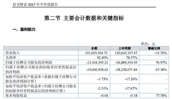 半年报显示,好买财富上半年实现营业收入1.02亿元,同比下滑15.76%。亏损1310万元,而去年同期亏损高达5689万元,减亏幅度约77%。