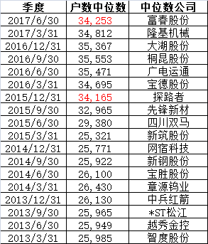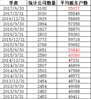 由于新股上市总是连续涨停,新股在目前市场环境中仍然具有一定溢价与炒作效应,因而统计股东户数的时候,剔除最新季度上市的股票,即统计2017年6月底上市公司股东户数,只统计到2017年3月底上市之前的公司,同理类推。