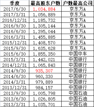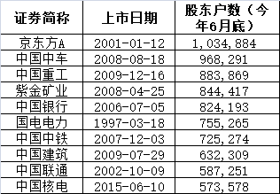 截至今年6月底,京东方A的股东户数由103.49万户,也是目前A股市场唯一一家股东过100万户的公司,中国中车以96.83万户的股东位居其后,中国重工、紫金矿业、中国银行的股东户数也都超过80万户。