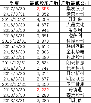 从最低股东户数来看,目前最低股东户数的公司是集友股份,今年1月份上市的一只次新股,持股的股东户数仅为2353户。已经降到2013年9月底的水平,创出近4年来新低。