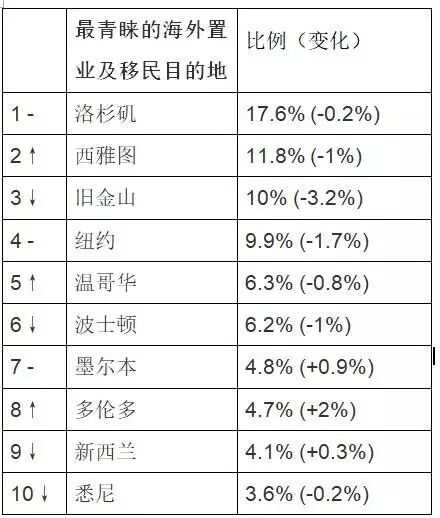 中国高净值人群所青睐的海外置业、移民目的地前十名依次为:洛杉矶、西雅图、旧金山、纽约、温哥华、波士顿、墨尔本、多伦多、新西兰和悉尼。其中,洛杉矶已连续四年成为中国高净值人群最青睐的海外置业和移民城市,西雅图逐年上升,今年首次超越旧金山,到第二位,旧金山退居第三,比例也下降最多。纽约维持第四,温哥华继去年下降一位之后,再次回到第五,波士顿则回落到第六,墨尔本维持去年的第七,多伦多上升两位,再次排到第八。
