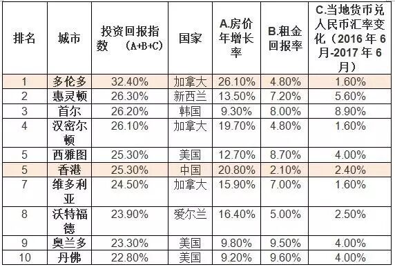 房价涨最多的加拿大的多伦多成为海外置业投资回报率最高的城市;其次是新西兰的惠灵顿,排名第三是韩国的首尔。