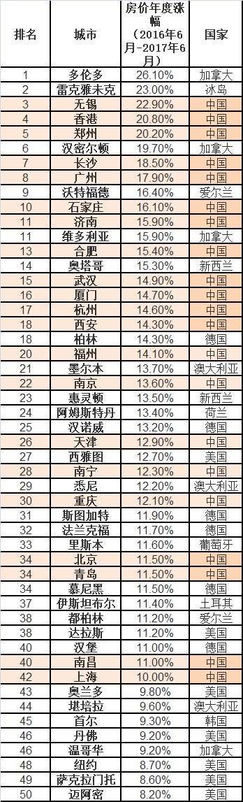 最近一年全球房价涨幅最高的前50名城市中,有42个涨幅在10%以上,第50名涨幅8.2%。有而上榜的中国城市涨幅都超过10%。