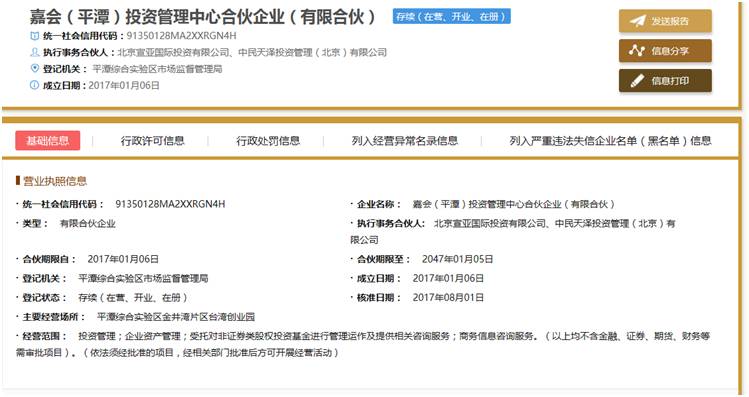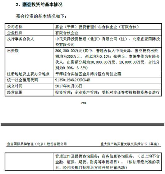 工商登记资料显示,嘉会投资成立于2017年1月,执行事务合伙人为北京宣亚国际投资有限公司、中民天泽投资管理(北京)有限公司。出资额30.02亿人民币,合伙人共14个,其中自然人7位,企业法人7个。