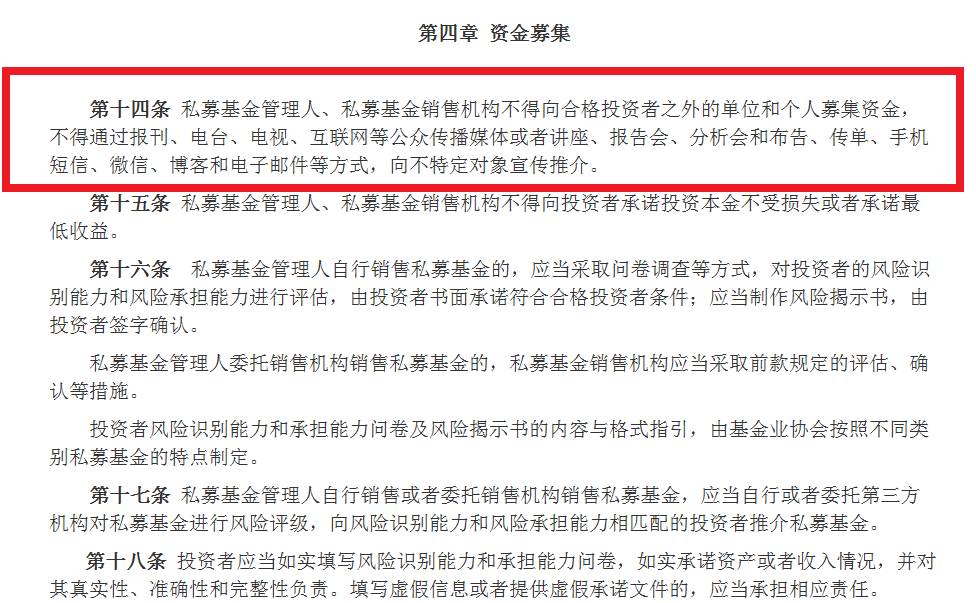 基金君详细查了一下,早在2014年8月21日公布实施的《私募投资基金监督管理暂行办法》里面,就明确表示:“私募基金管理人、私募基金销售机构不得向合格投资者之外的单位和个人募集资金,不得通过报刊、电台、电视、互联网等公众传播媒体或者讲座、报告会、分析会和布告、传单、手机短信、微信、 博客和电子邮件等方式, 向不特定对象宣传推介。”