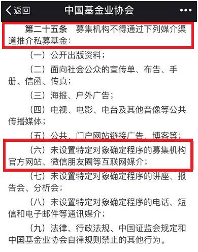 同时,也规定,“募集机构不得通过下列媒介渠道推介私募基金,包括未设置特定对象确定程序的募集机构官方网站、微信朋友圈等互联网媒介。”