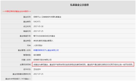 从基金业协会备案信息来看,“招银天山—云南省城市发展私募基金”是由新疆招银新投天山基金有限公司发行,招商银行托管,今年5月18日成立,7月25日备案,该基金产品是债权基金,基金财产按照合同约定投资相应的债权类项目。基金财产通过委托贷款的方式用于政府土地一级开发项目。