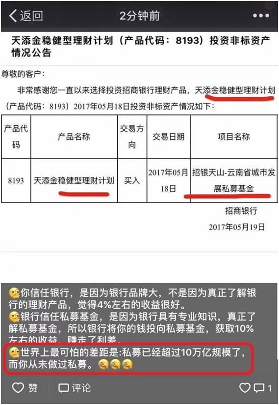仔细一看,原来这条朋友圈是介绍了招商银行的一款理财产品,该理财产品的投向是一只私募基金。