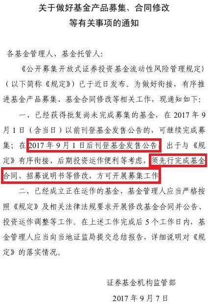 有基金公司人士告诉记者,9月以后发行的新基金都要修改合同,所以还没有发新基金的,他们就干脆选择撤回,等调整好相关内容之后再发行。监管层要求在合同中加入流动性新规的内容,他表示,现在他们还不确定合同需要具体如何更改,他估计可能有些条款要根据流动性新规做出“格式”调整,而这种调整的范围不仅是货币基金,而是涉及更多基金类型。