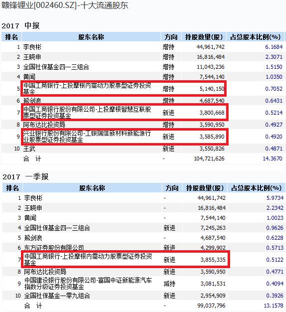 上投摩根旗下的两只产品,包括内需动力股票型基金、智慧互联股票型基金,分别持有赣锋锂业514.02万股、380.07万股,占比为0.71%、0.52%,一只基金为增持,一只则是新进。工银瑞信新材料新能源行业股票型基金二季度也新进了赣锋锂业,持股为358.59万股,占比为0.49%。
