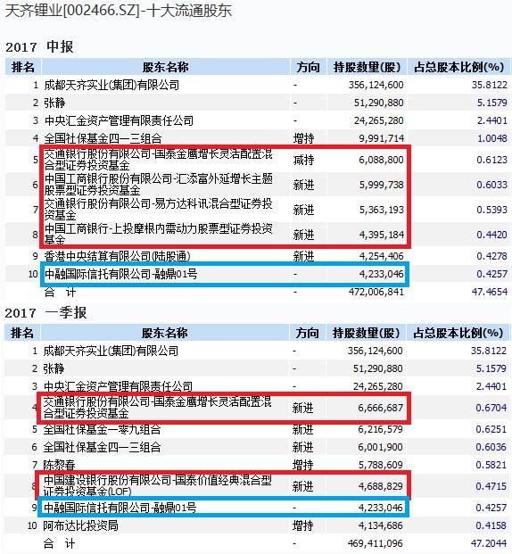 中融信托—融鼎01号上半年持有天齐锂业423.3万股,占总股本的0.43%,两个季度均持股不变,可见其看好。