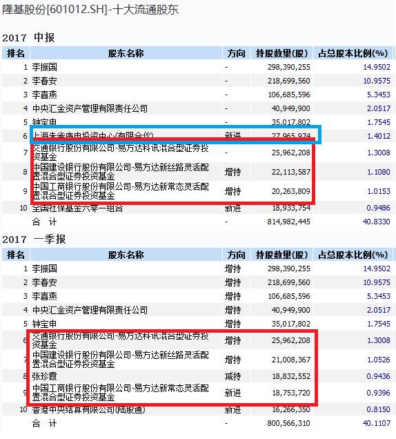 公募基金中,易方达基金公司旗下的三只基金在2017年第一季度末和第二季度末均重仓隆基股份。