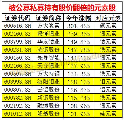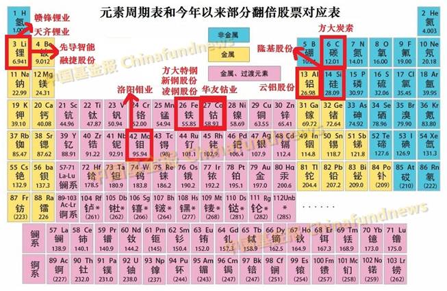 无论是公募基金,还是私募基金,今年都在重点看元素周期表,找准其中的投资机会,并且已经重仓持有了不少上述今年暴涨的元素股。