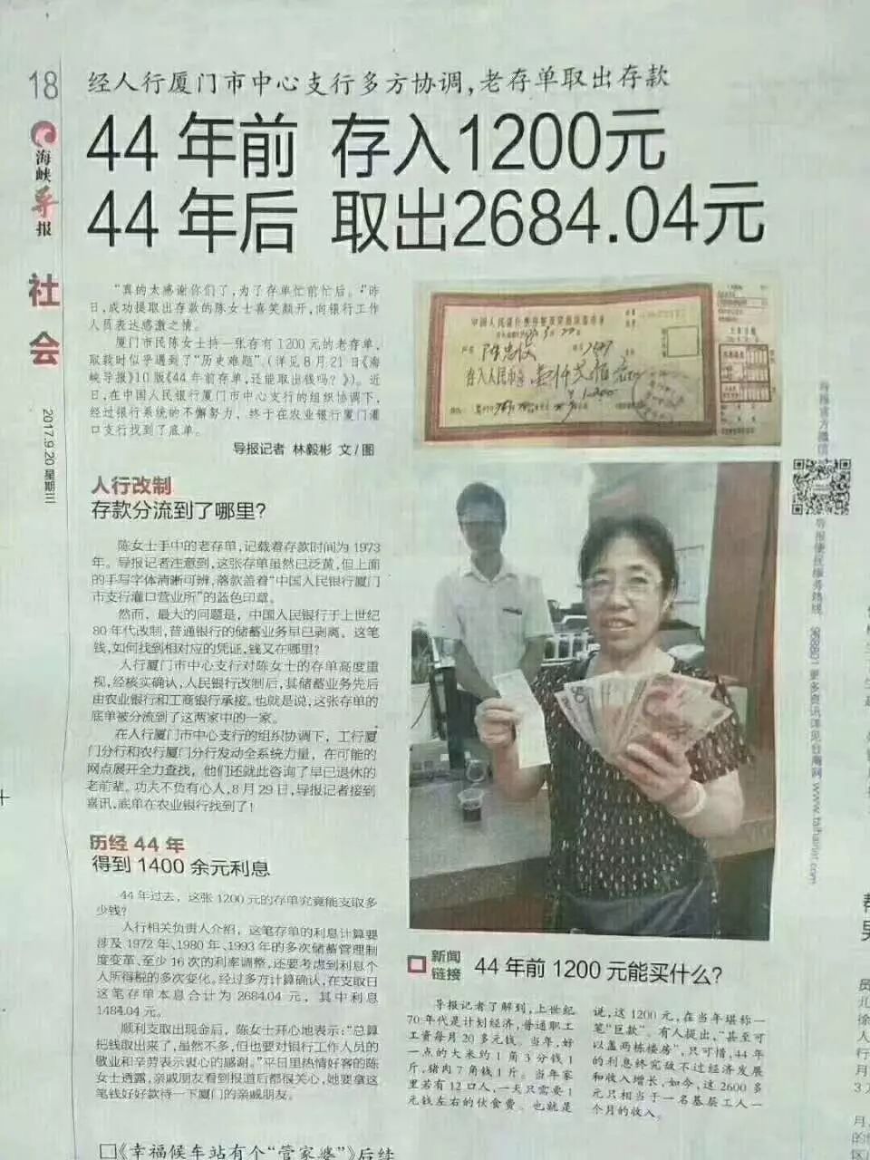 报道称,厦门一女子44年前(1973年)存入银行1200元,历经44年,得到1484.04元利息,如今取出2684.04元。