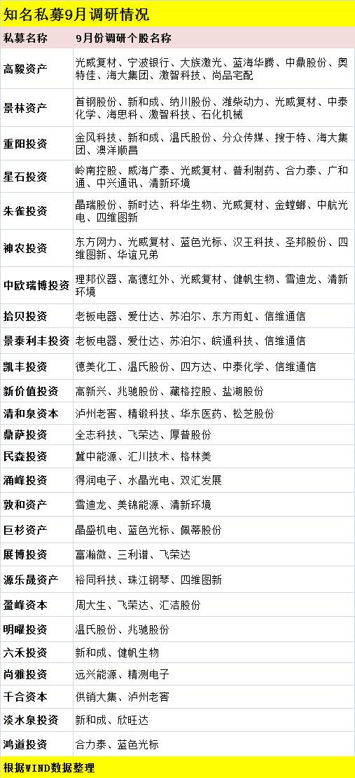 还有朱雀投资、景林资产、景泰利丰投资、宏道投资等私募,下半年调研次数均超过了20次。此外,王亚伟的千合资本,今年下半年调研次数也达到4次,包括供销大集、泸州老窖、神火股份、*ST华菱。基金君统计了9月以来的知名私募调研情况。