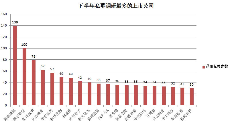 WIND数据也显示,从个股来看,下半年,受私募关注度最高的是海康威视、歌尔股份、汇川技术、天齐锂业、华东医药、科华生物、利亚德、环旭电子、科大讯飞、信维通信等上市公司。其中海康威视受到139家私募调研,歌尔股份则受到100家私募调研。