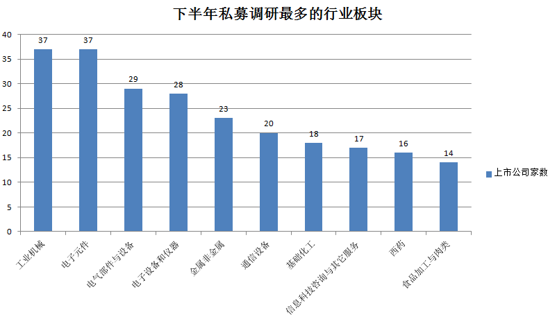 来看看私募基金都关注哪些行业和板块?基金君做了个统计,下半年有751家上市公司受到调研,其中有私募机构参与的有542家,主要集中在工业机械、电子元件、电气部件与设备、电子设备和仪器、金属非金属、通信设备、基础化工、信息科技咨询与其它服务、西药、食品加工与肉类等行业。