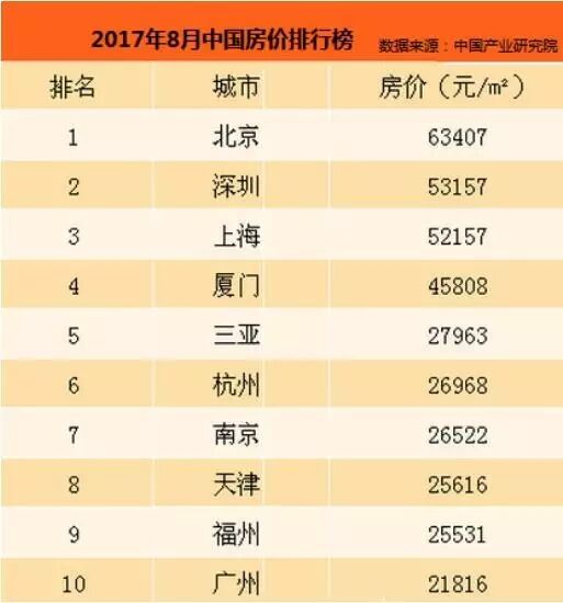 中国产业研究院的平均房价数据显示,北京、深圳和上海的平均房价超过5万,其次是厦门平均房价也有4.5万,杭州、南京、天津、福州的房价在2.5万到2.8万之间,广州由于城市周边房子供应多,总平均价2.2万左右。