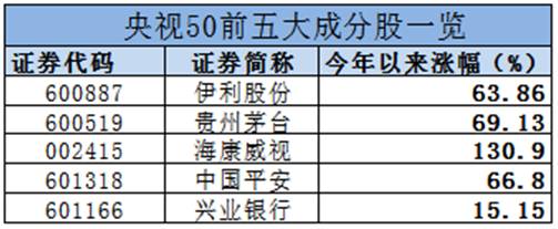 该指数成分股今年以来表现强劲。其中,前五大成分股分别为伊利股份、贵州茅台、海康威视、中国平安、兴业银行。截至10月17日,这些个股今年以来涨幅分别达到63.86%、69.13%、130.9%、66.8%、15.15%。