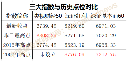 如果对比2007年上证指数6124点时的各大指数点位,央视财经指数成立时间较晚,没有经历2007年,深证红利和深证基本面60指数目前都距离2007年的高点差异很小。