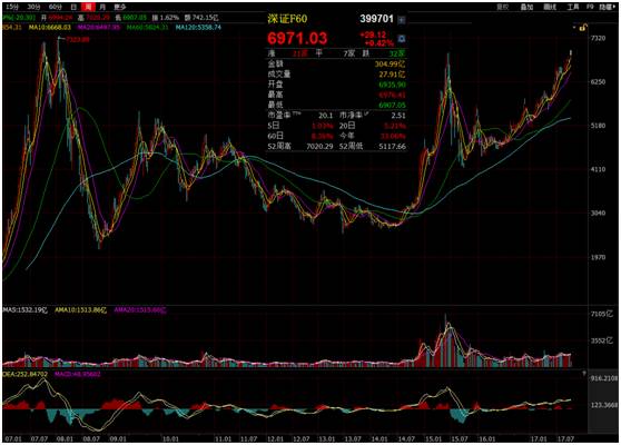 再看看深证基本面60指数的历史表现,该指数今年以来的涨幅达到了33.06%,并且已经超过了2015年的高点。昨日该指数最高达到了7020.29点,今日收盘点位为6971.03点,都已经超过了2015年的年度高点6958.33点。