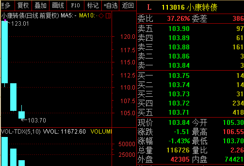 11月21日上市的小康转债,上市首日开盘价123元熔断,而后不断下行,今天第三天,市价已跌至103.84元。