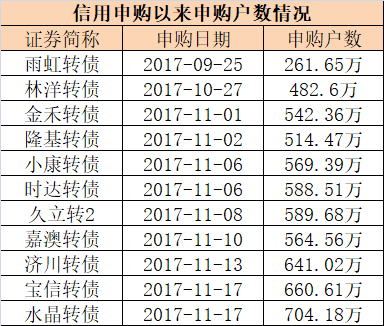 在可以不需要市值的信用申购下,最近这两个月投资者参与可转债申购的热情火爆。从9月25日首只雨虹转债162万户申购,到11月17日的水晶转债已有704万户申购了。