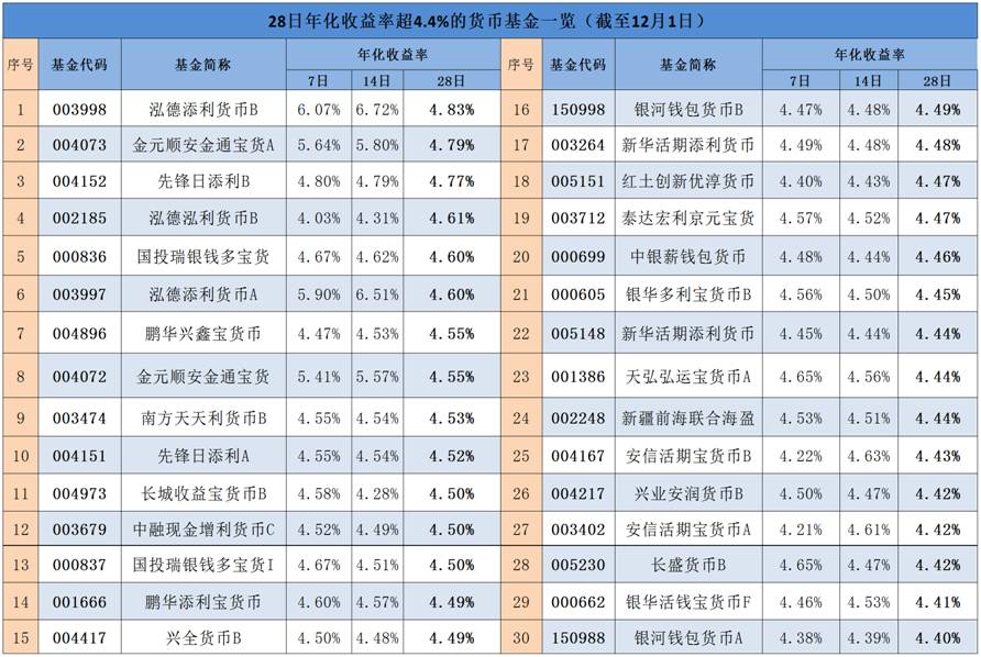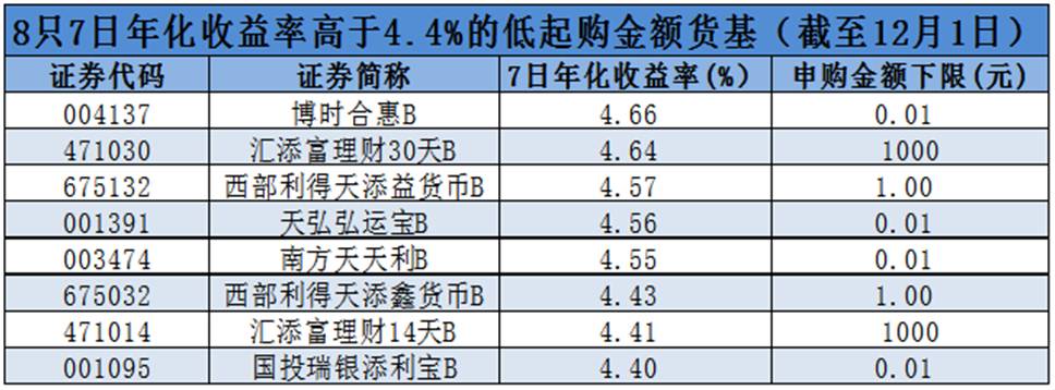 基金君统计发现,截至12月1日,起购金额为0.01元至1000元的B类货币基金中,过半7日年化收益率超过4%,其中8只产品7日年化收益率高于4.4%。博时基金公司旗下“博时和惠B”的7日年化收益率最高,达到4.66%。