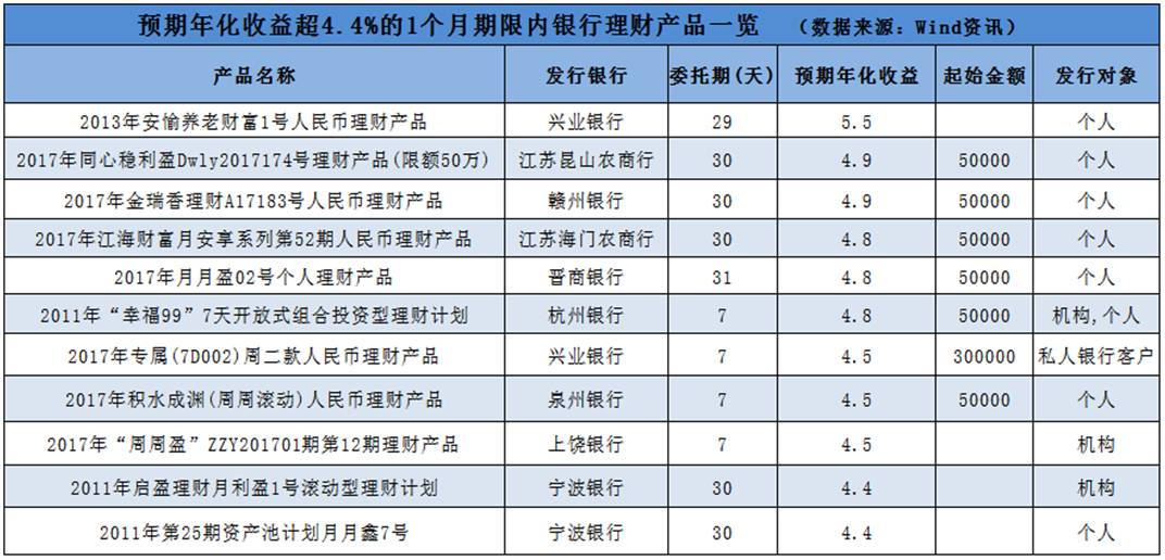 目前可统计到确切预期年化收益率的一个月内银行理财产品有130只,这些产品的预期年化收益率平均下来为3.21%,其中收益超过4.4%的有13只产品。看着还不错,但是这些产品并非想买就能买,有些产品只提供给机构或者私人银行客户,而且大多数产品起始金额是5万元。年底手头本来就紧,5万元可不是小数目。