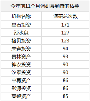 好买统计,今年前11个月,调研次数最多的前五的私募为星石、淡水泉、拾贝、朱雀、景林。