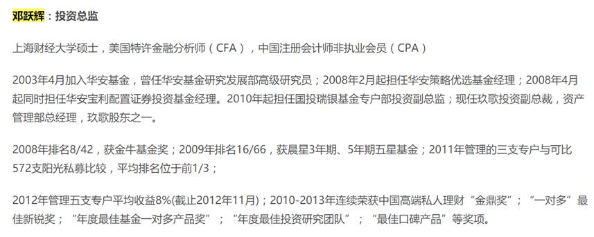 邓跃辉,历任公募基金经理、专户投资副总监、私募基金副总裁,再到如今自立门户做私募。