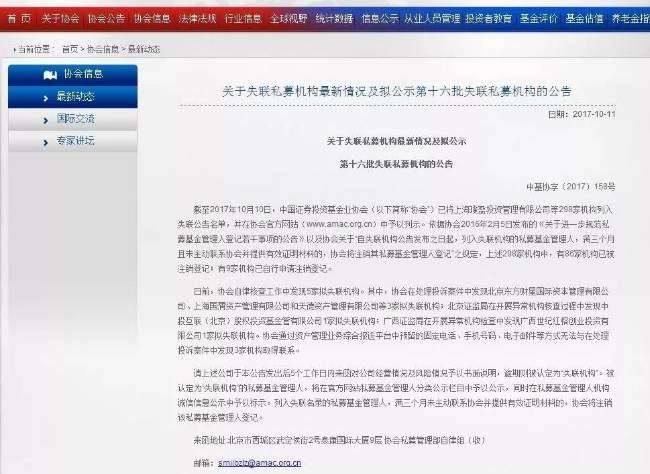 今年10月11日,中国证券投资基金业协会发布了第十六批拟失联私募机构名单,其中就涉及北京东方财星国际资本管理有限公司,协会表示,是在处理投诉案件中发现该机构失联的。目前该机构已被列入失联私募名单。