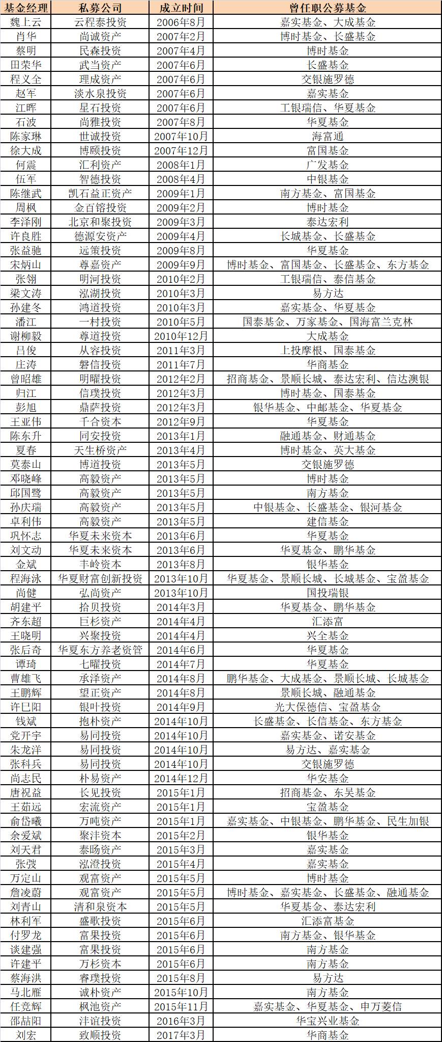 2007年,最早一批公奔私的基金经理中,创立星石投资的江晖、创立尚雅投资的石波都是曾经的“老华夏”,江晖1998年4月到2004年8月在华夏基金任职;石波1998年10月到 2007年8月任职于华夏基金。而后2009年、2010年,曾在华夏基金任职的张益驰、孙建冬也先后创办远策投资和鸿道投资,2012年也有曾任职华夏的彭旭创立鼎萨投资。